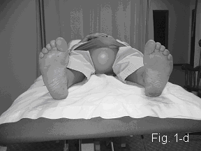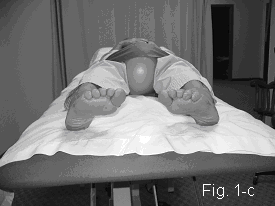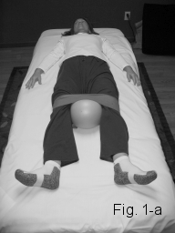 Place band around knees and ball between knees as shown (Fig. 1-a) Lay on your back with knees straight or on a slight pillow Gently roll the knees out against the band for 10 seconds (Fig. 1-b) Gently roll the knees inward against the ball for 10 seconds (Fig. 1-c) Rest for 10 seconds (Fig. 1-d) Repeat above sequence ten times and do 3 times per day for a total of 30 - but not all at once. Remember to roll in and out gently.